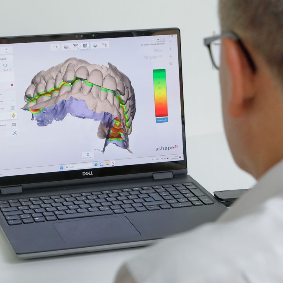 Dank digitalem Fortschritt erstellen wir in unserer Praxis mithilfe einer schlanken Mundkamera eine digitale Aufnahme der Zahnsituation. Aus diesen Bilddaten können wir am Bildschirm Inlays, Kronen, Schienen sogar kompletten Zahnersatz konstruieren. Die Daten werden ans Labor weitergeleitet – quasi als digitaler „Abdruck“. Daraus werden im Labor der Zahnersatz oder die benötigten Schienen für Ihre Behandlung gefertigt.